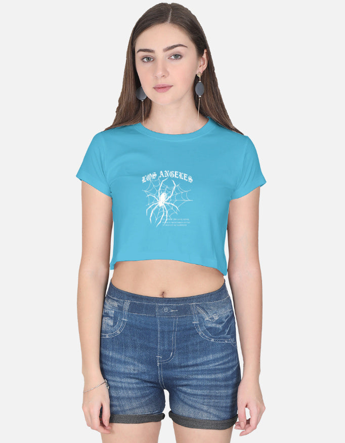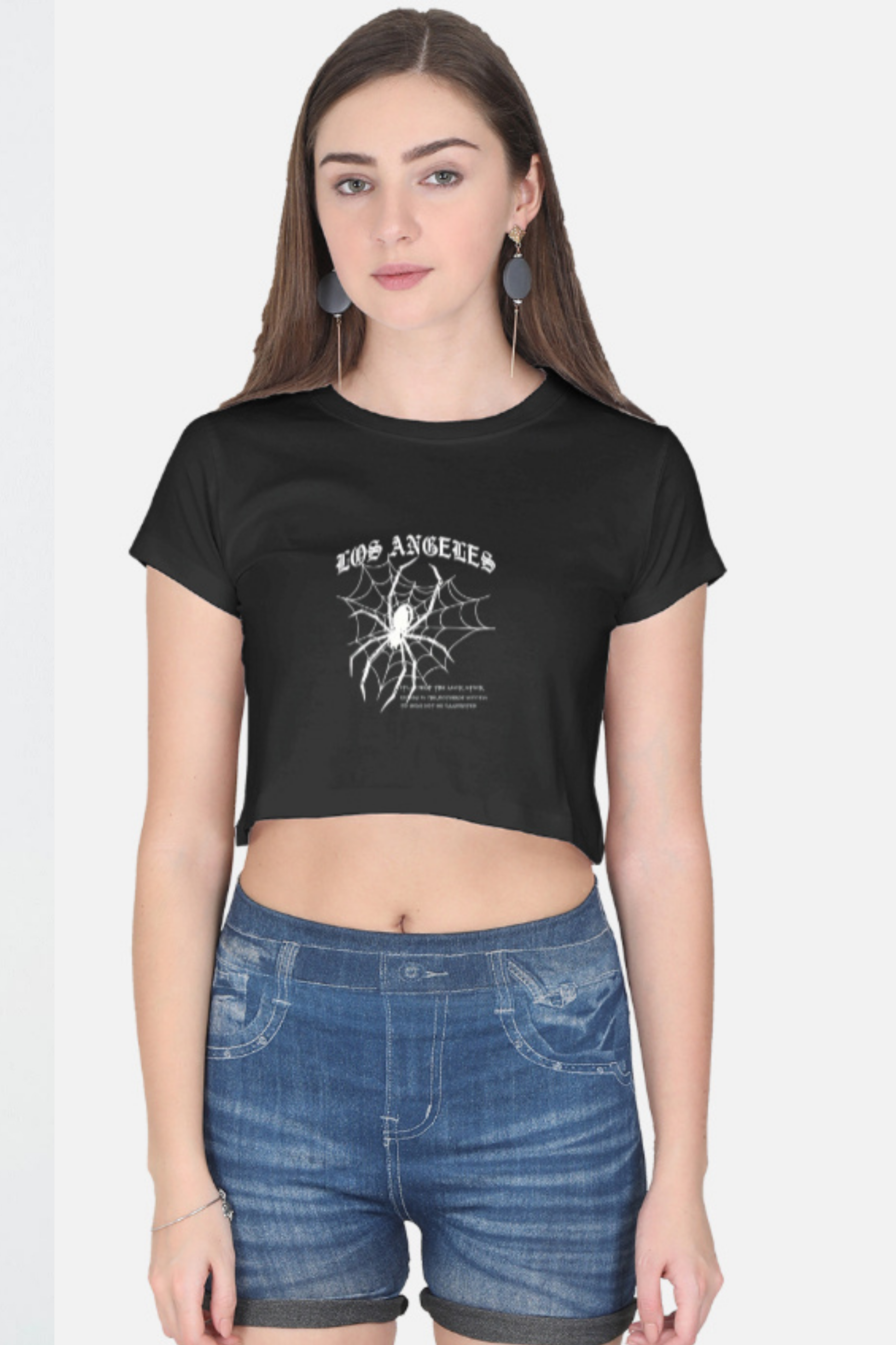The striking graphic features a detailed spider nestled in its web, framed by "LOS ANGELES" in a classic Gothic font. The design is finished with a cryptic quote, adding a layer of mystery and depth to this unapologetic grunge aesthetic. Made from soft, breathable black cotton, this crop top has a comfortable, slightly relaxed fit that's perfect for everyday wear.
