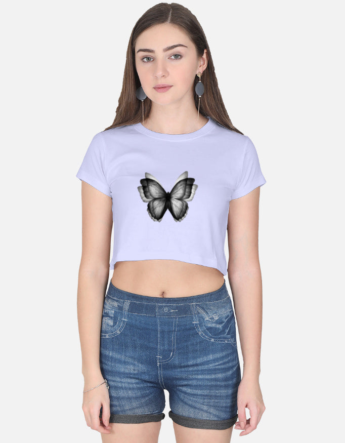 Minimal and dreamy. This cropped tee showcases a detailed grayscale butterfly centered on a jet‑black base for a chic, understated statement. The above‑waist cut flatters high‑rise jeans, skirts, and shorts, while the soft crew neck and cuffed sleeves keep it comfortable for everyday wear, coffee runs, or night outs.