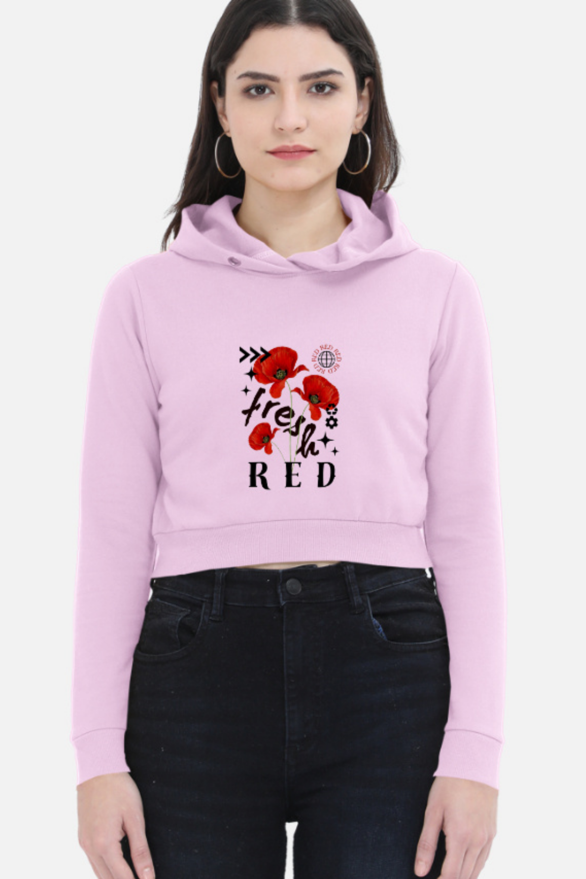 Description: Embrace soft romance with our Fresh Red Poppy Crop Hoodie. This delicate design features vivid red poppy flowers paired with subtle dark accents and the playful text "fresh RED." The vibrant flowers pop against the sweet light pink fabric, creating a look that's both beautiful and bold. Made from a comfortable, cozy material, this cropped silhouette is perfect for layering with high-waisted jeans or skirts. It’s an effortless way to add a touch of poetic nature to your everyday style.