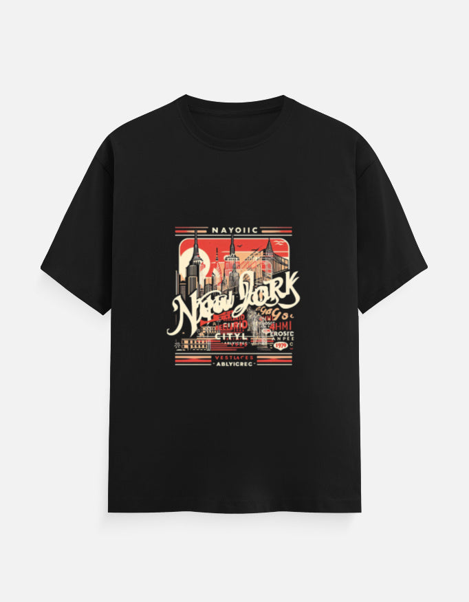 Celebrate the energy of the Big Apple with our Retro New York Skyline Graphic T-Shirt. Featuring a bold, vintage-inspired cityscape and stylized “New York” typography, this tee captures the spirit of NYC with a nostalgic twist. The vibrant red, beige, and cream tones contrast perfectly against the deep black fabric, making this shirt a true standout.