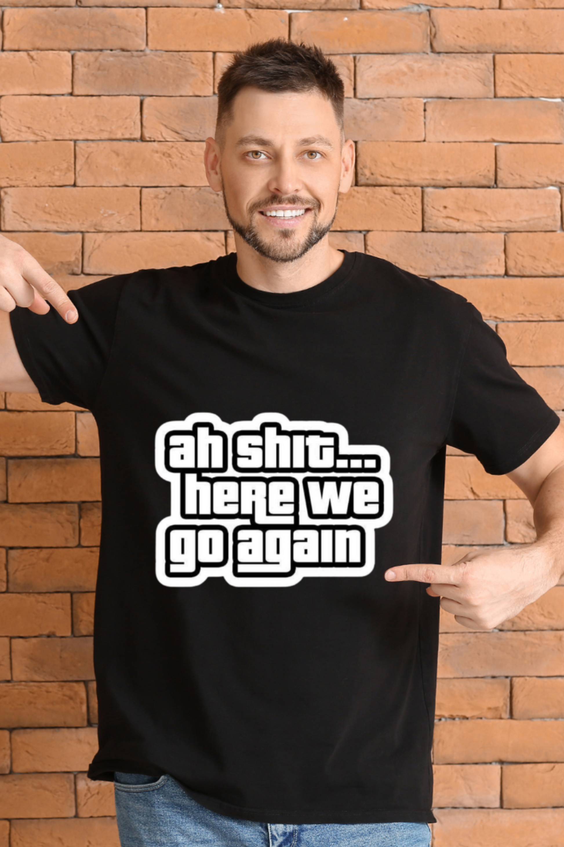 Bring the legendary meme to life with our "Ah Shit, Here We Go Again" t-shirt, inspired by the iconic GTA San Andreas intro. Perfect for gamers and meme lovers, this tee features bold, nostalgic graphics on a soft, breathable black cotton fabric. Whether you're heading out or just vibing at home, it's a statement of humor, relatability, and retro gaming culture.