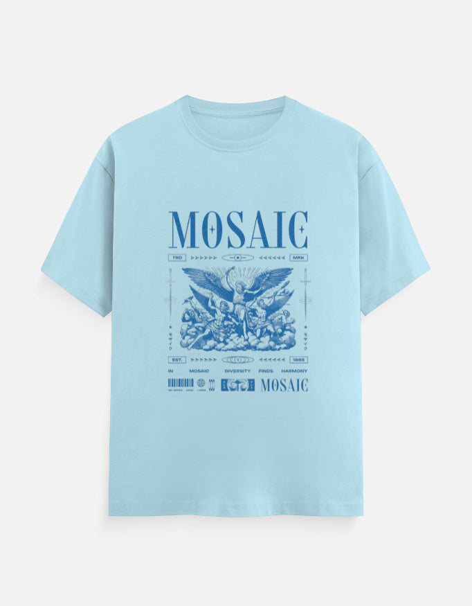 The MOSAIC Tee is more than just a graphic shirt—it's a statement on diversity, strength, and interconnectedness. Featuring an intricate blue linework illustration inspired by classical frescoes, it portrays a powerful angelic figure rising amidst a crowd, symbolizing unity emerging from conflict. With layered motifs like barcodes, codes, and languages, this piece reflects a harmonious blend of history, culture, and streetwear.