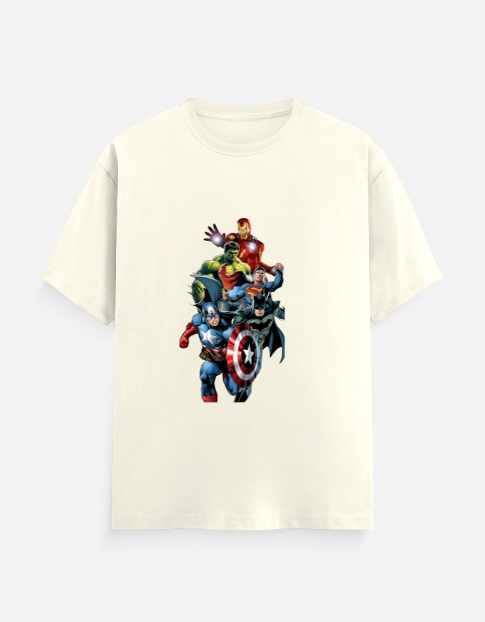 Assemble the fit. This bold comic‑style tee features a dynamic stack of armored, super‑strong, stealthy, and shield‑bearing heroes in vivid, high‑contrast color that pops against a deep black base. The poster‑quality illustration brings instant action‑movie energy, while the relaxed, drop‑shoulder silhouette keeps it comfortable for everyday wear, fan meets, or casual nights out.