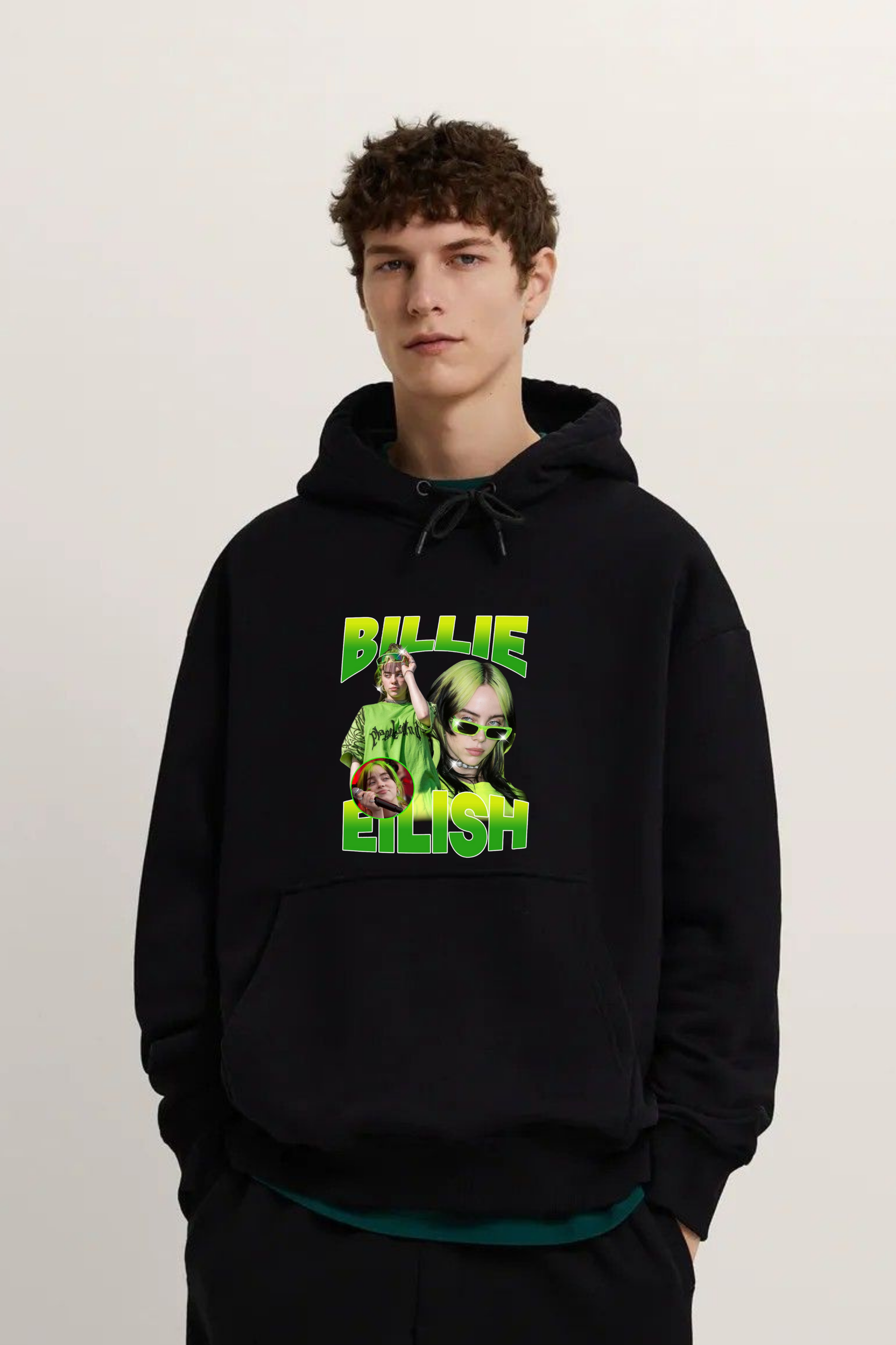 Capture the electric energy of Billie Eilish with this standout graphic hoodie. Featuring a classic portrait photo framed by bold, neon green and yellow typography, this design perfectly captures her iconic look. The vibrant graphic pops against the deep black pullover, making a bold statement whether you're at a concert or just hitting the streets. Crafted from a soft, heavyweight cotton blend, this hoodie is built for comfort and style