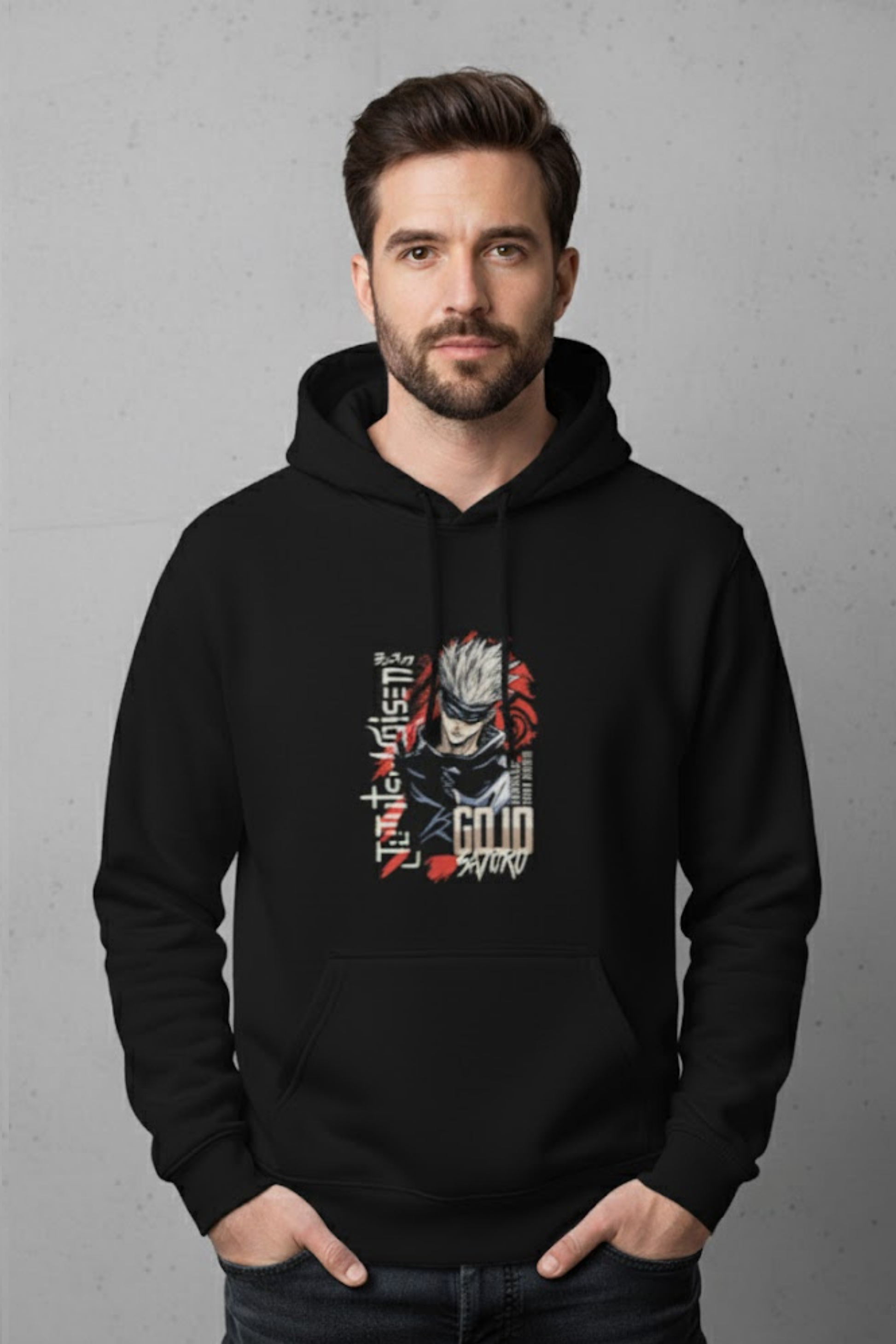 Unleash the power of the Six Eyes with this bold graphic hoodie. Featuring the iconic Gojo Satoru from Jujutsu Kaisen, the design captures the legendary sorcerer with his blindfold, surrounded by stylish Japanese typography and a vibrant red accent. Printed on a classic black, comfortable fleece, this hoodie is a must-have for every anime fan who wants to show off their favorite Special Grade Jujutsu Sorcerer. Your new uniform for a cursed world.