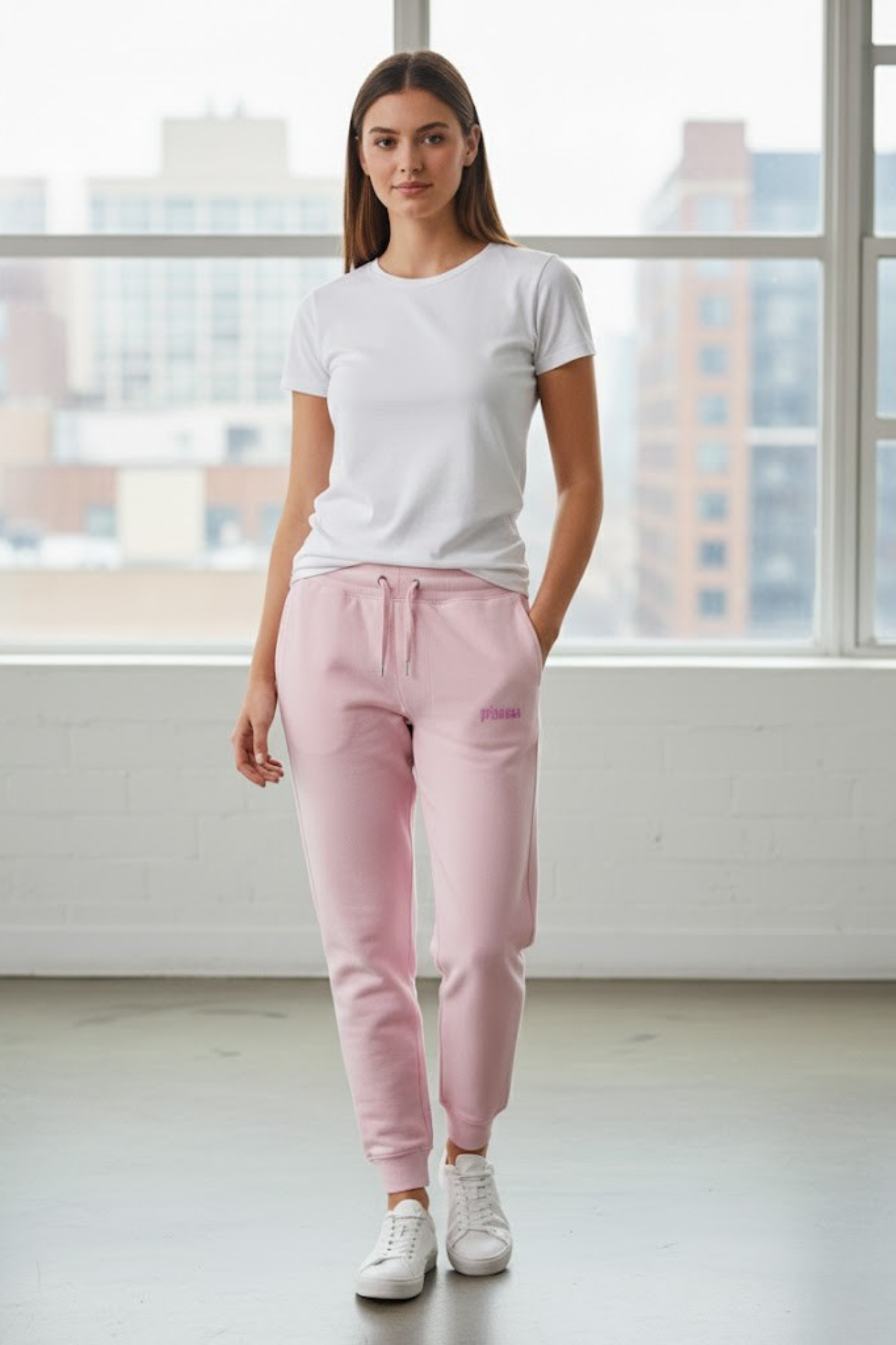 Lounge like royalty in the "Princess" Tapered Joggers. Made from cloud-soft fleece in a dreamy pastel pink, these joggers feature a flattering tapered fit that's perfect for both cozy nights in and stylish casual wear. The finishing touch is the subtle, elegant pink-on-pink "princess" embroidery on the left thigh. It's a sweet, empowering detail that elevates these from basic loungewear to a charming statement piece.