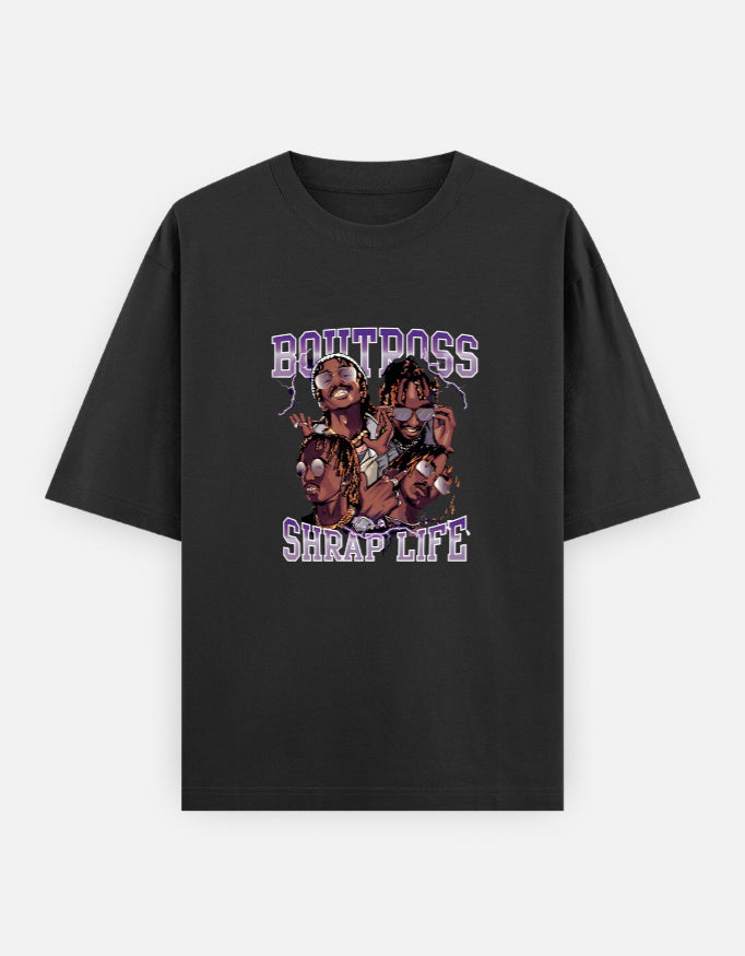 Bring the raw energy of the movement to your wardrobe with this essential Boutross Shrap Life Vintage Bootleg Tee! This design is a must-have for fans and anyone who rocks authentic hip-hop style. --- Design Details: This tee captures the true essence of '90s rap merchandise. It features a striking montage of the artists, rendered in a stylized, dark-toned, distressed portrait graphic. The iconic names "BOUTROSS" and "SHRAP LIFE" are stacked in a bold purple and white shadow font that gives the whole design an electric, throwback edge. Product Features: * Fit: Unisex, oversized fit for that perfect relaxed, street-style comfort. * Color: Classic Black cotton makes the purple-accented graphic pop fiercely. * Style: Made from soft, quality material, this is a ready-to-wear statement piece. Throw it on with your favorite baggy denim or joggers to instantly elevate your streetwear game.