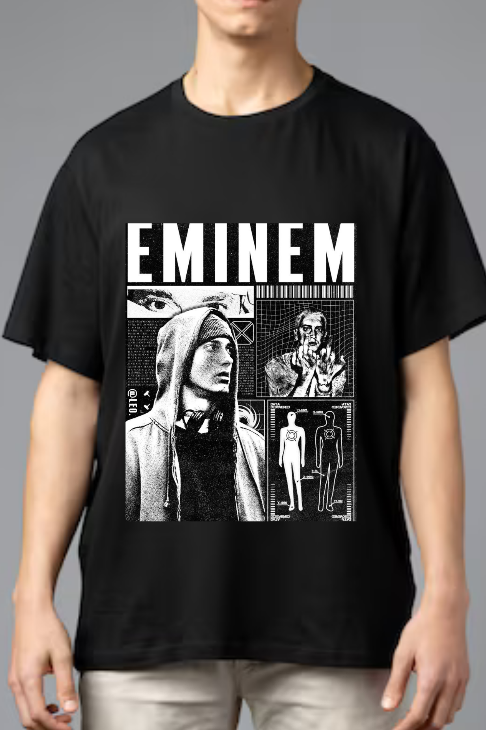Turn up the volume with a monochrome collage tee inspired by rap’s fiercest storyteller, laid out in bold panel art beneath a striking block “EMINEM” header. The graphic mixes gritty close‑ups, stage‑ready silhouettes, and comic‑strip textures for a raw, editorial edge that pops against deep‑black fabric. Cut in a relaxed unisex fit with a classic crew neck, the midweight cotton jersey feels soft, breathable, and built for heavy rotation. High‑definition printing keeps the contrast sharp and details crisp through wash after wash. Machine wash cold inside out; tumble dry low.