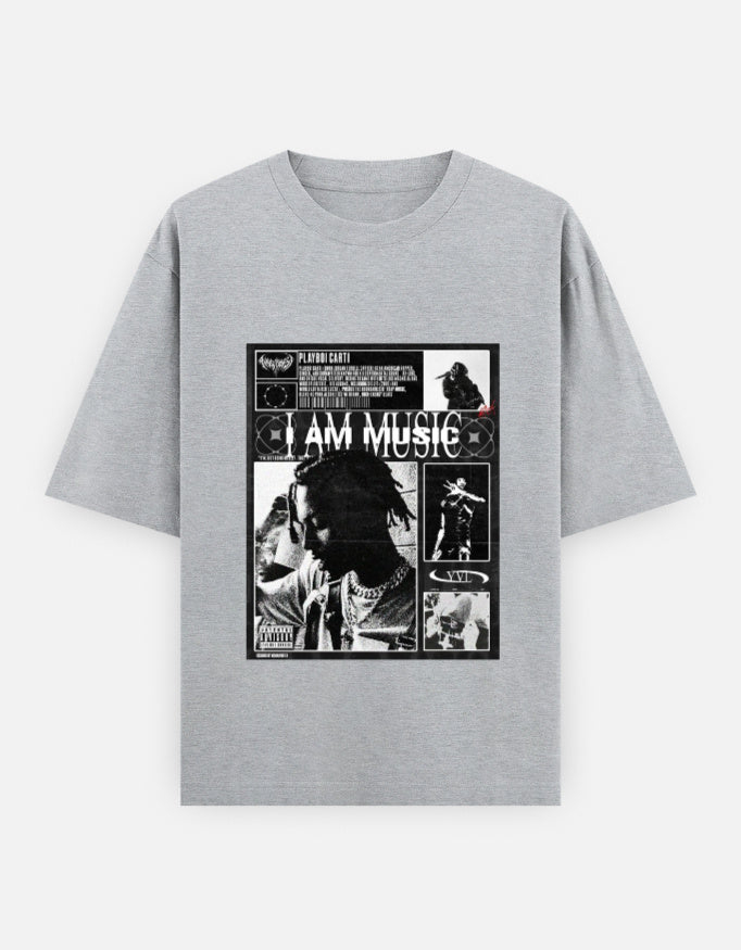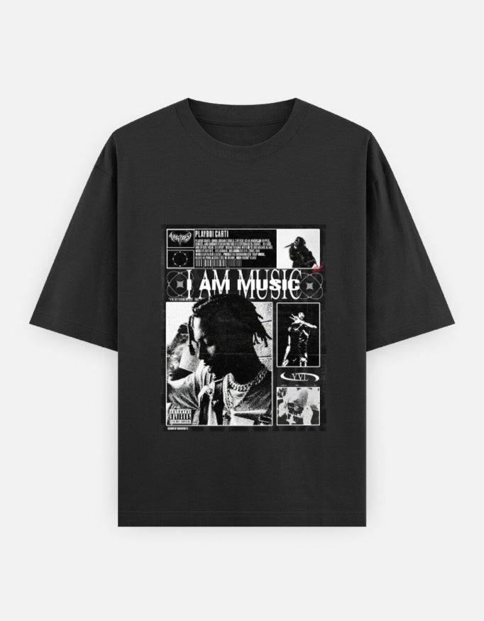 This graphic tee features a bold black-and-white design with multiple images of the rapper and his signature "I Am Music" slogan. The vintage aesthetic combines elements of streetwear and album art to create a powerful visual statement, reflecting Carti's unique impact on the music world. Perfect for fans of Carti's music and fashion-forward style, this tee offers comfort with its oversized fit and pairs effortlessly with jeans or joggers for an effortlessly cool, urban look.