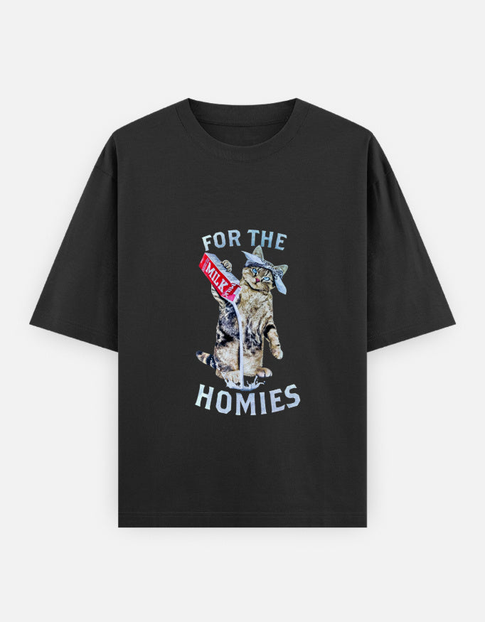 Get a little playful with this bold black graphic tee featuring a fun, quirky design. The shirt showcases a cool cat rocking a bandana and holding a milk carton, with the phrase "For the Homies" in stylized text. It’s the perfect blend of street style and humor for those who want to rep their crew in a lighthearted way. The matching embroidered cap adds an extra touch, completing the look with the same "For the Homies" graphic. This oversized tee is made from soft, comfortable cotton, ensuring you stay cool and stylish all day long.
