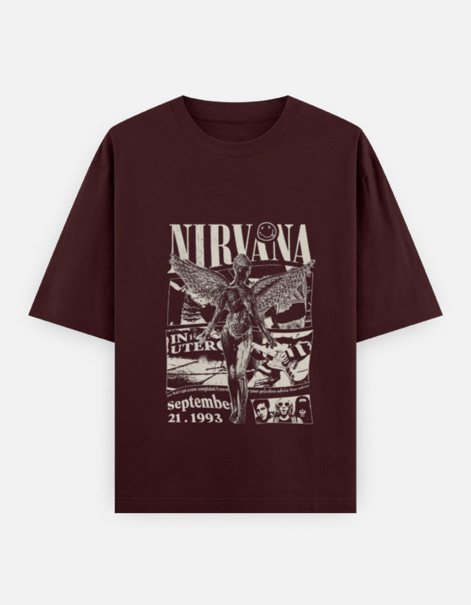 Showcase your love for the iconic band Nirvana with this "In Utero" graphic tee. This black oversized shirt features the legendary album artwork with a vintage feel, paying homage to one of rock music’s most influential releases. The detailed angel graphic from the album cover, along with the "September 21, 1993" release date, adds a nostalgic touch to your wardrobe. Paired with a matching embroidered cap, this set is perfect for any Nirvana fan or lover of grunge culture. Crafted from soft, breathable cotton, this tee delivers comfort while making a bold statement.
