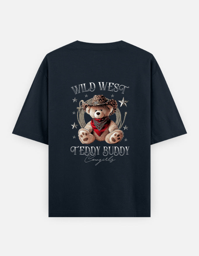 Saddle up with the cutest outlaw in town — the "Wild West Teddy Buddy" Oversized Tee. This soft black tee features a vintage-style teddy bear dressed in full cowboy drip: leopard hat, red bandana, and surrounded by stars and lassos. It's the perfect mix of cozy, quirky, and country-core.
