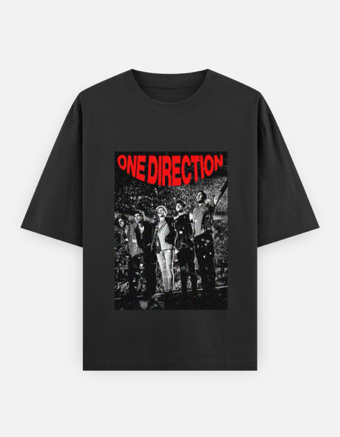 Relive the magic of stadium anthems and unforgettable nights with our One Direction Stadium Tour Tee. Featuring a bold red logo and a nostalgic black-and-white photo of the band mid-performance, this oversized graphic tee is a must-have for every true Directioner. Designed for comfort and style, it brings concert energy straight to your everyday wardrobe.