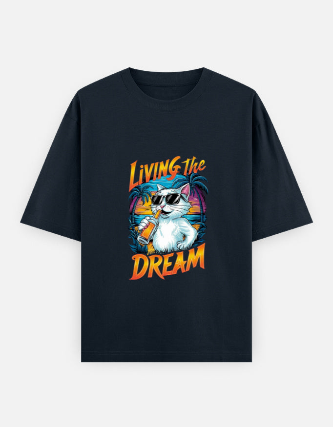 Turn heads and chill hard in our Living the Dream oversized tee. Featuring a laid-back white cat in sunglasses sipping a cold drink against a tropical sunset, this bold and vibrant graphic is perfect for those who don’t just dream — they live it. Printed on a premium black oversized fit, this shirt brings ultimate comfort with maximum attitude. Pair it with your favorite jeans, joggers, or shorts for the ultimate relaxed vibe.