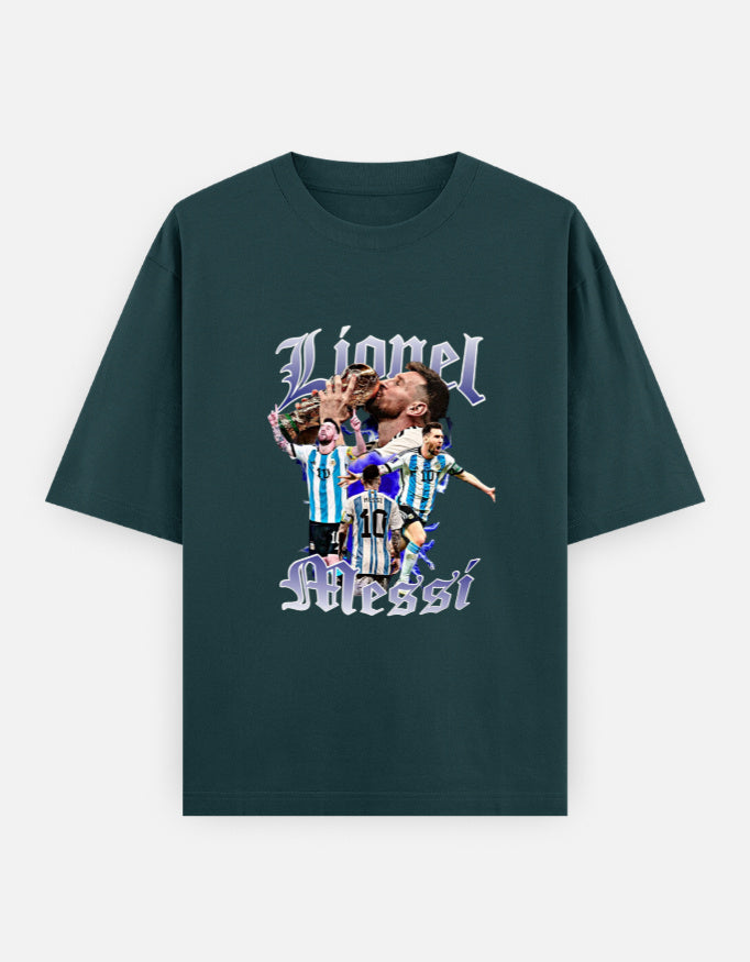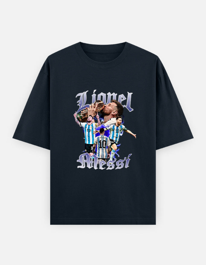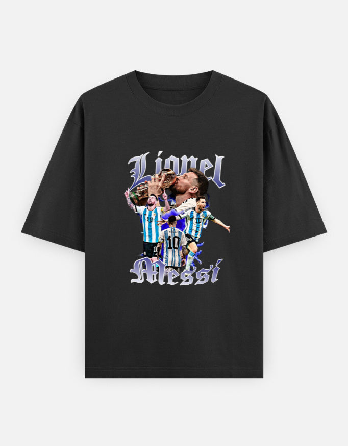 Celebrate the GOAT in style with our Lionel Messi Legend Tee. This oversized black T-shirt features a bold collage of Messi’s most iconic moments in the Argentina jersey, from World Cup glory to unforgettable celebrations. Made for true fans, this design blends streetwear edge with sports royalty.