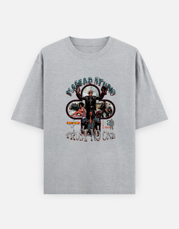 Channel raw street energy and vintage flair with the “Trust No One” oversized tee. Featuring bold, distressed artwork and nods to hip-hop legends like 2Pac, this piece captures the gritty essence of 90s rap culture and underground streetwear. Designed with a washed-out, retro aesthetic, this tee speaks volumes—loyalty is rare, and trust is earned. Complete with a matching embroidered cap for a fully loaded fit.