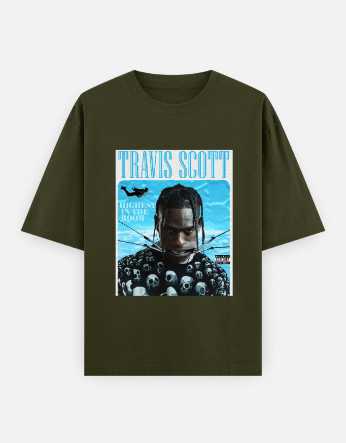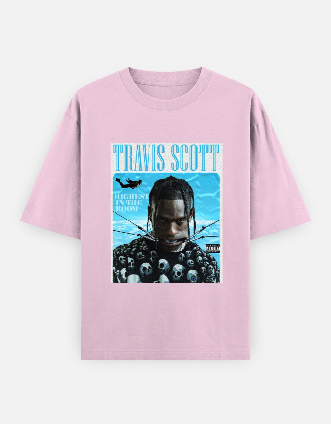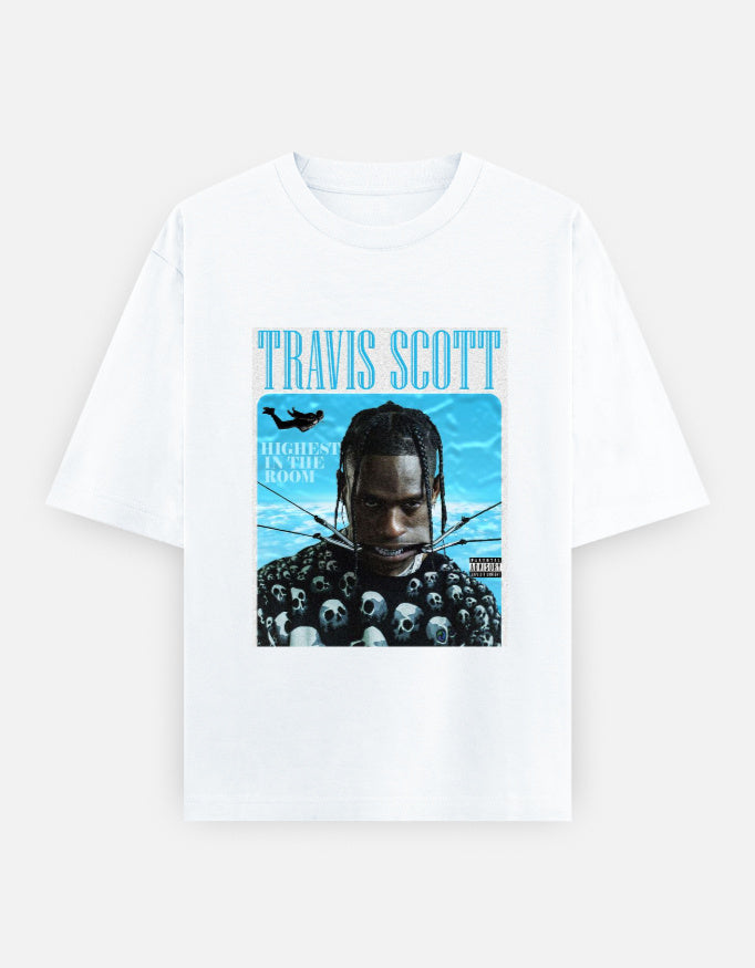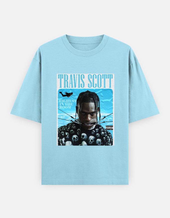 Rep your style with this sky-blue oversized T-shirt and matching cap set, featuring the iconic artwork from Travis Scott’s hit single “Highest in the Room.” The tee showcases a bold front graphic with Travis Scott's image, surrounded by edgy skull details and a high-contrast aesthetic. Paired with a coordinated cap sporting the same album artwork, this set is perfect for fans who want to blend streetwear vibes with music culture.