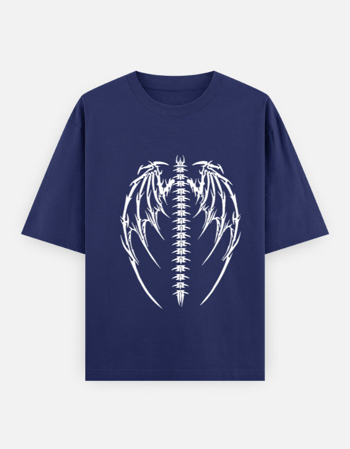 Unleash your dark side with the Spine Wing Graphic Tee. Featuring a bold, high-contrast white print of a stylized spine and wings on the back, this shirt brings a perfect fusion of gothic and streetwear aesthetics. Made from soft, breathable cotton with a relaxed oversized fit, it's designed for comfort and edge. Whether you're hitting the streets or making a statement, this tee has your back — literally.