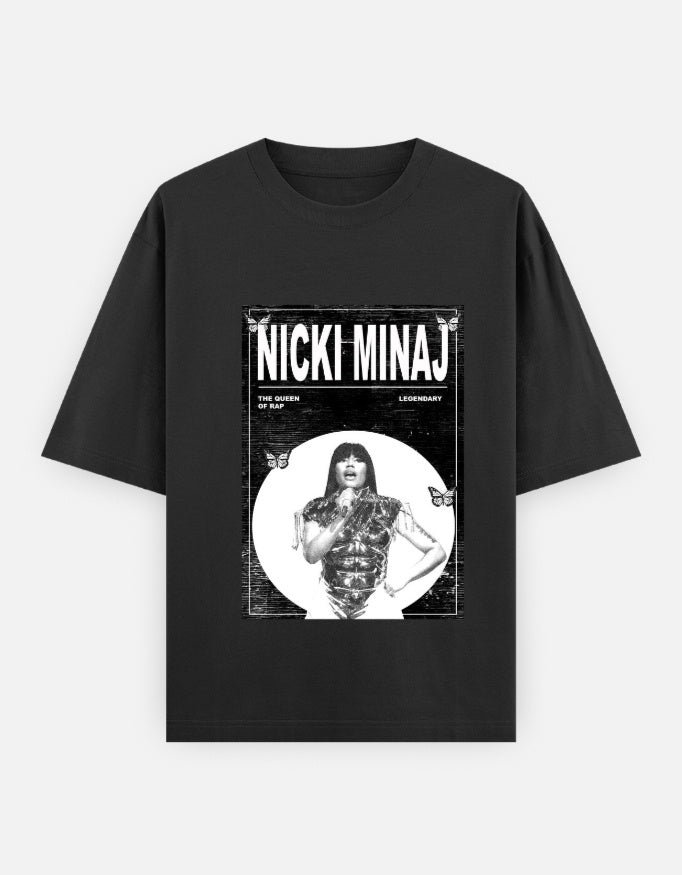 All hail the queen. The Nicki Minaj "Queen of Rap" Vintage Poster Tee is a bold tribute to an icon who redefined the game. Featuring a high-contrast black-and-white performance shot of Nicki in her prime, this oversized tee is framed like a vintage magazine cover — complete with gothic butterflies and distressed poster textures for that old-school flair.