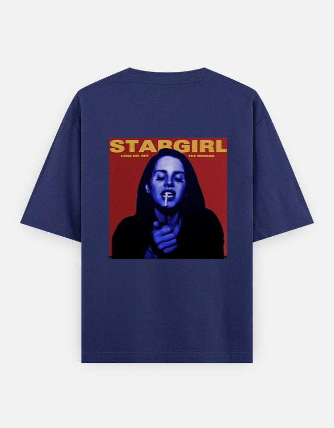 Step into the spotlight with our Stargirl Graphic Tee, featuring a bold design inspired by the iconic collaboration between Lana Del Rey and The Weeknd. This oversized black t-shirt showcases a vivid, retro-style print on the back, with Lana captured in a cinematic moment under moody red and blue hues. Made from soft, breathable cotton for all-day comfort, this tee is perfect for fans who live for music, mood, and making statements.