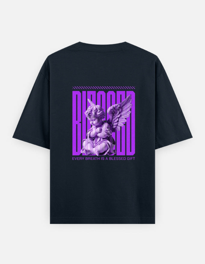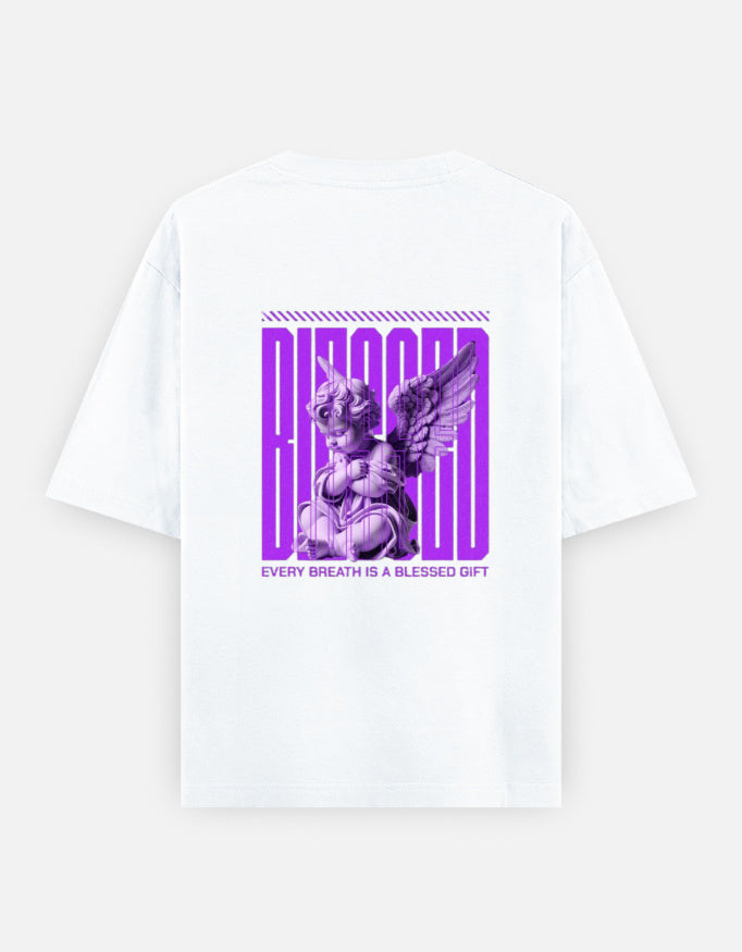 Transcend the ordinary with the Blessed Breath Angel Tee, a powerful visual piece merging streetwear with celestial energy. The back features a striking 3D-rendered angel in radiant violet, paired with the uplifting message: “Every breath is a blessed gift.” Surrounded by futuristic typography and divine detail, this oversized black tee serves as both a fashion statement and a daily reminder of gratitude.