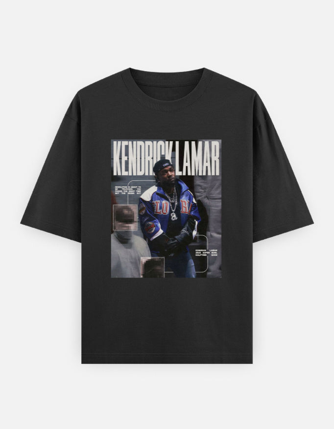 The design highlights a central portrait of Kendrick Lamar, framed by his name in a bold, distressed font. The graphic has a subtle grainy texture and a retro feel, making it a unique statement piece.