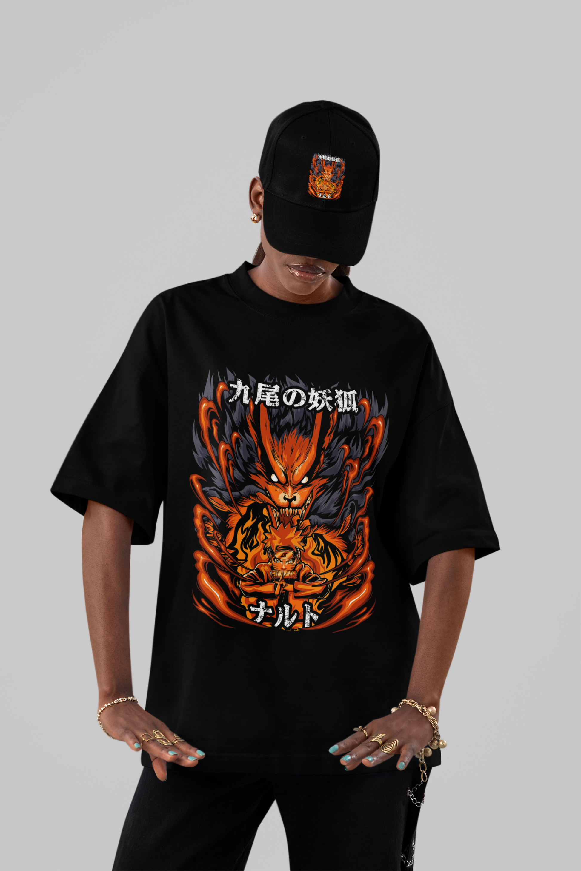 Unleash your inner beast with our Nine-Tailed Fox Demon T-Shirt. This design features the powerful Kurama, also known as the Nine-Tailed Fox, in a striking and detailed illustration. The vibrant orange and red flames contrast sharply against the black background, highlighting the demon's ferocious expression and the intense power surrounding the tiny Naruto. This tee is a must-have for any fan of the legendary series. The Japanese characters for "Nine-Tailed Fox" (九尾の妖狐) and "Naruto" (ナルト) are also included, adding an authentic touch to this incredible graphic.