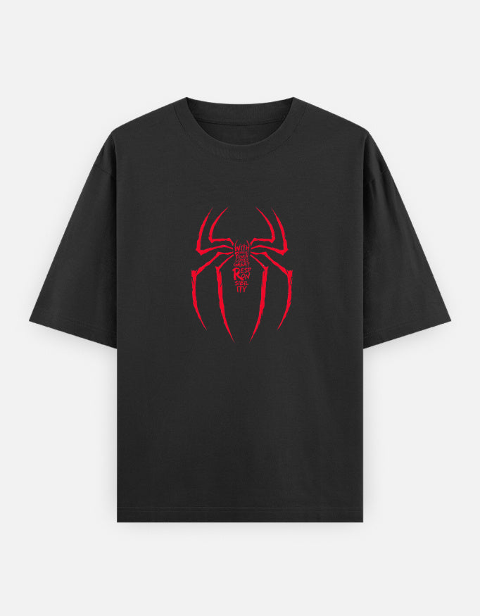 This t-shirt combines the iconic spider symbol with one of the most famous quotes in comic book history. The design features a bold, crimson red spider graphic with the text "With great power comes great responsibility" woven into its body. A striking and minimalist design for any true fan of the web-slinger, this tee captures the essence of his journey.