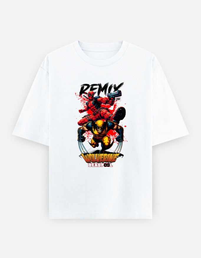 Bring together two of the most popular and formidable mutants with our Wolverine and Deadpool Team-Up T-Shirt. This dynamic design features both anti-heroes in action, with Wolverine's claws extended and Deadpool ready to fire. The vibrant red and yellow art pops against the white background, and the "REMIX" title suggests a fresh take on their legendary rivalry. This tee is a perfect way for fans to celebrate the chaotic and powerful duo.