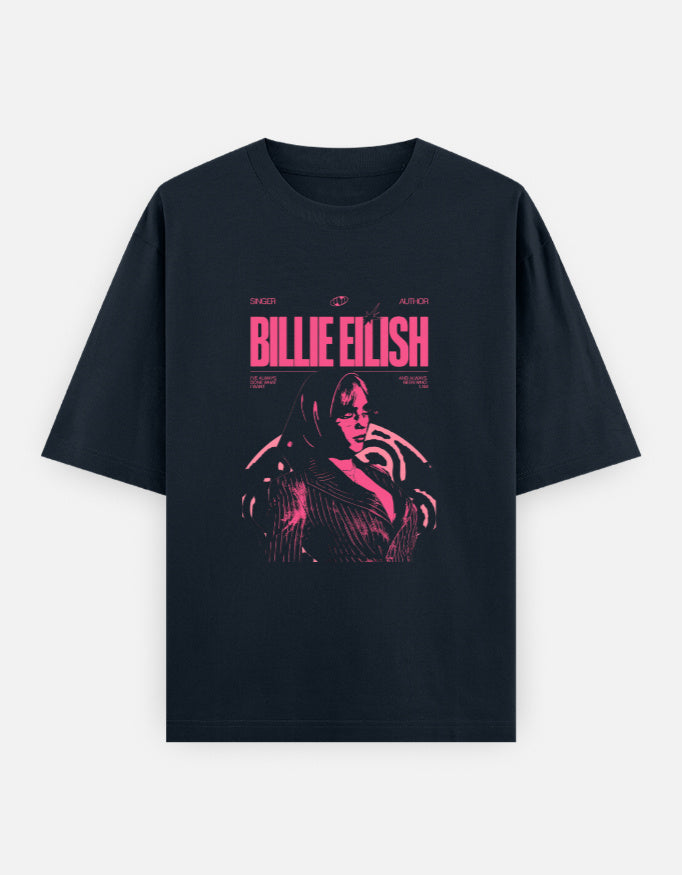 This striking black tee features a stylized portrait of Billie in a vibrant neon pink print, set against the dark fabric for maximum contrast. The bold text of her name and titles like "SINGER" and "AUTHOR" give it an authentic, concert-merch feel.