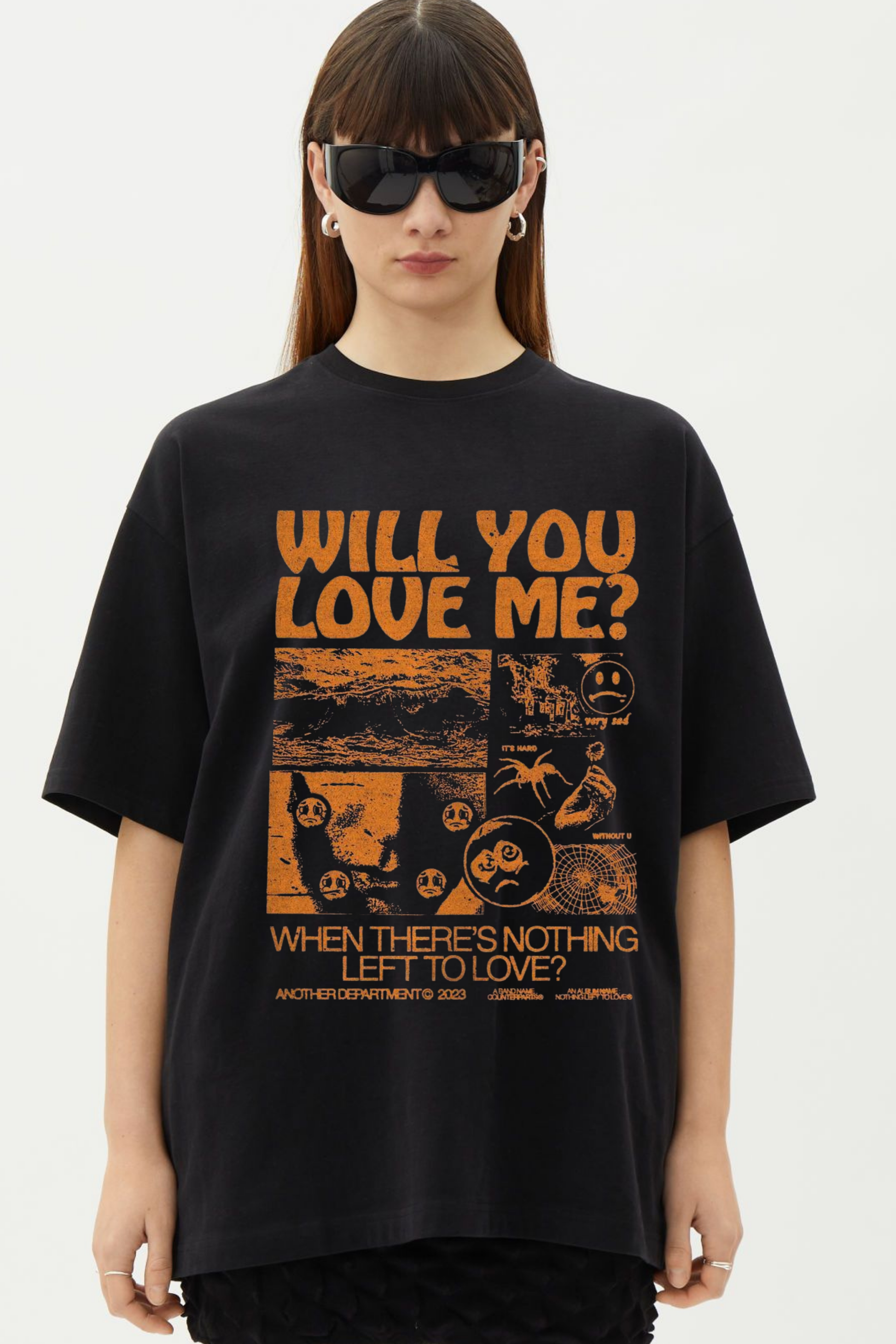 Design Details: The front of the shirt features a powerful graphic collage in a bold, rusty orange against a deep black background. The design is split into four panels, each with a unique, raw illustration that captures a moody, existential aesthetic. The central, impactful text asks, "WILL YOU LOVE ME? WHEN THERE'S NOTHING LEFT TO LOVE?", making this shirt a true statement piece that blends art, emotion, and a touch of vintage grunge.