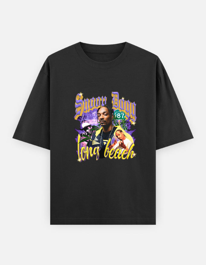 The front features a multi-image collage of Snoop, complete with his name in a stylized, throwback font and a nod to his hometown, "Long Beach." The vibrant mix of purple, yellow, and orange gives the design an authentic, retro feel.