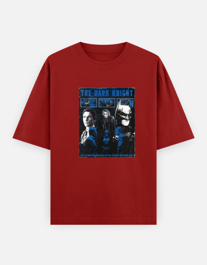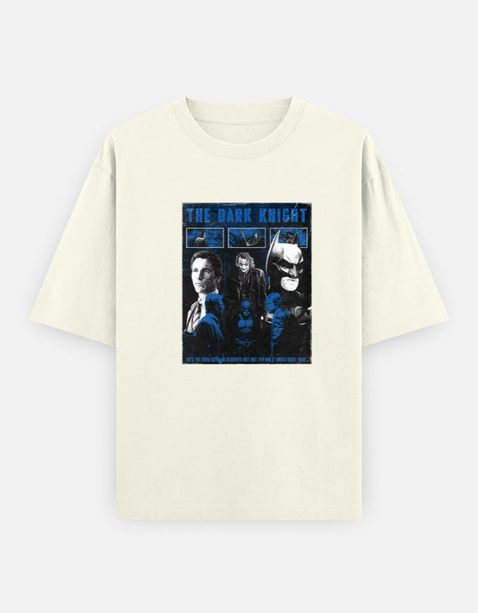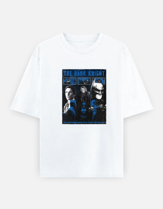 This is the perfect tee for any fan of the iconic superhero saga. This oversized graphic t-shirt features a striking comic-book-style design, showcasing the key characters of the legendary trilogy in a bold, dynamic blue hue. The three-panel graphic highlights the hero, Batman, the ultimate villain, The Joker, and the city's White Knight, Harvey Dent.