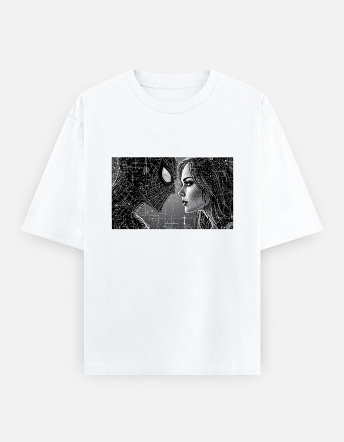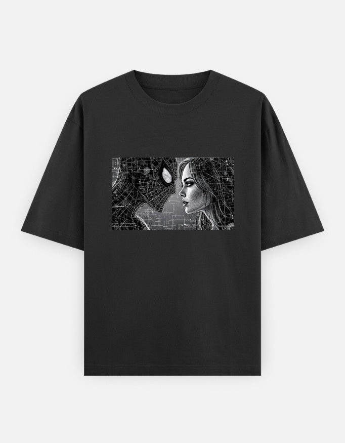 Dive into the intricate web of the Spider-Verse with this striking monochrome graphic tee. The unique design features a detailed, high-contrast graphic of a stylized Spider-Man and a female character, rendered in a sophisticated black and white palette. The two are set against a mesmerizing, intricate background of interconnected lines, giving the design a modern, artistic feel.