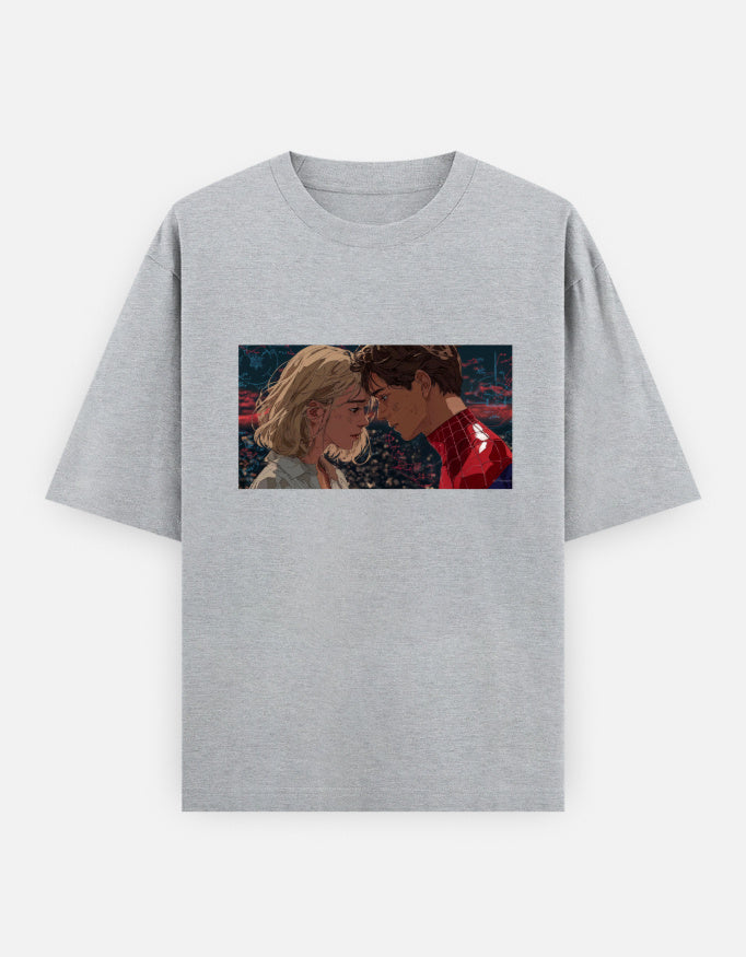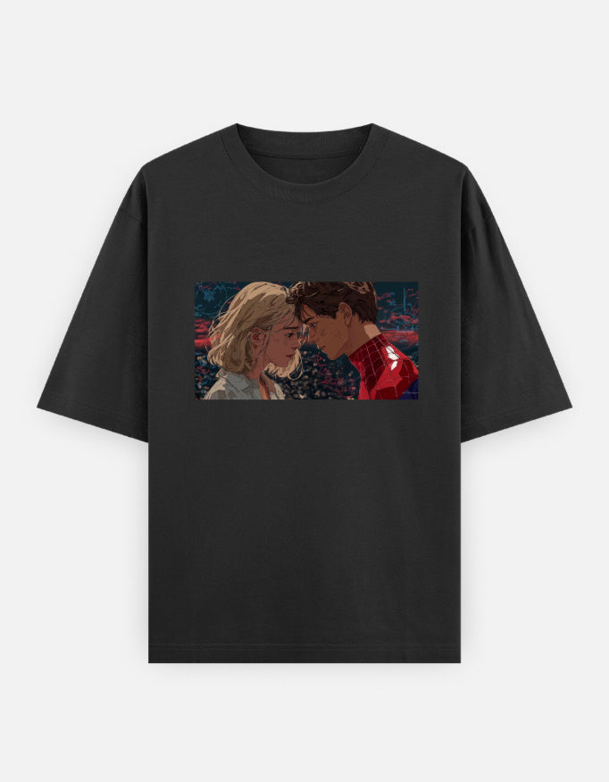 Capture a moment of true connection with our Spider-Verse "Falling" Oversized Graphic Tee. This t-shirt features a stunning, high-quality graphic that depicts a tender moment between Peter Parker and Gwen Stacy. The realistic, cinematic art style and emotional depth of the design celebrate one of the most beloved relationships in comic book history.