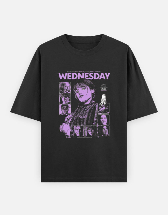 This oversized black tee features a stunning, high-contrast lavender graphic inspired by the hit Netflix series Wednesday. The design captures a retro horror movie poster aesthetic, centered on Jenna Ortega as Wednesday Addams and surrounded by a striking grid of key Nevermore characters. With the series title prominently displayed, this piece is an instant conversation starter.