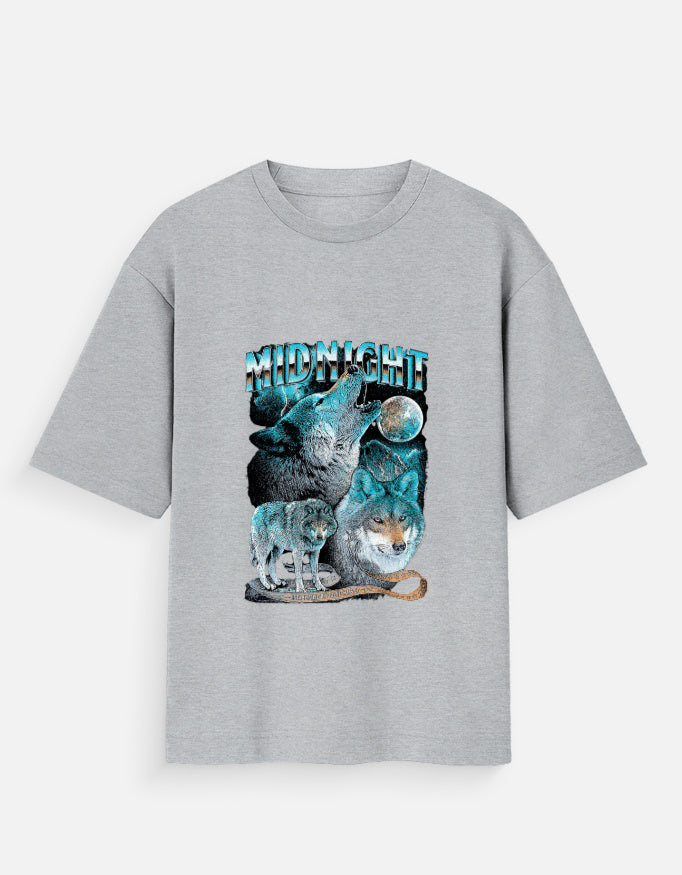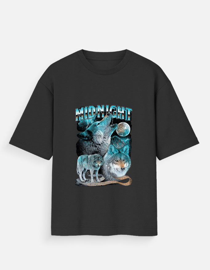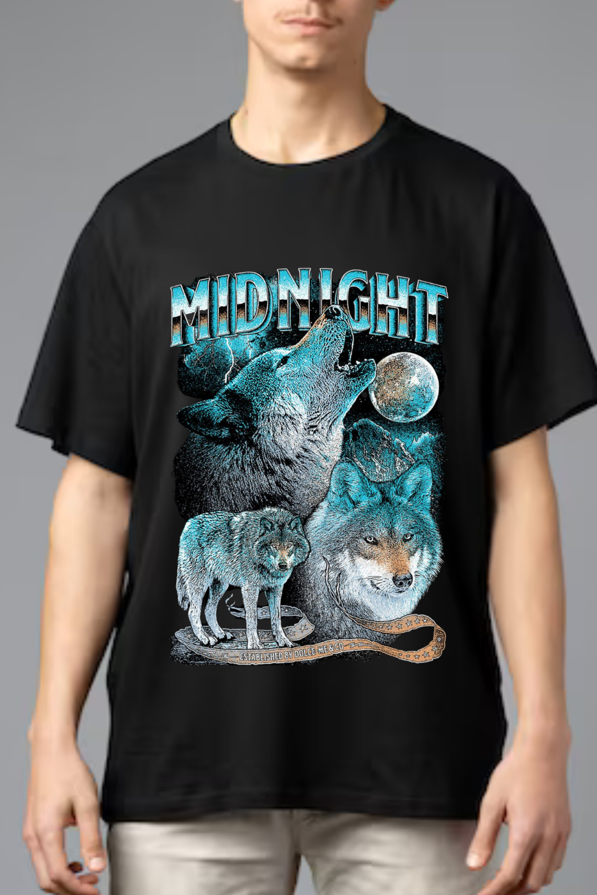 Answer the call of the wild with this cinematic “Midnight” tee featuring a howling wolf, lunar backdrop, and layered pack portraits in icy blue highlights. Printed on deep black, mid-weight fabric, it delivers a relaxed, drop‑shoulder silhouette for effortless comfort and bold streetwear style. The high‑contrast artwork blends vintage tour‑tee texture with modern detail, pairing perfectly with jeans, cargos, or layered fits.