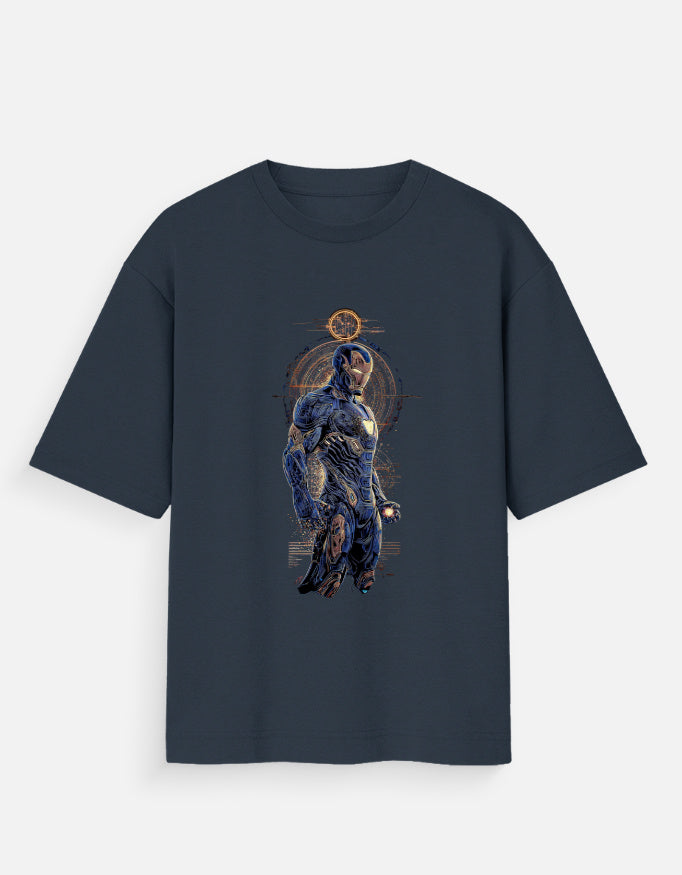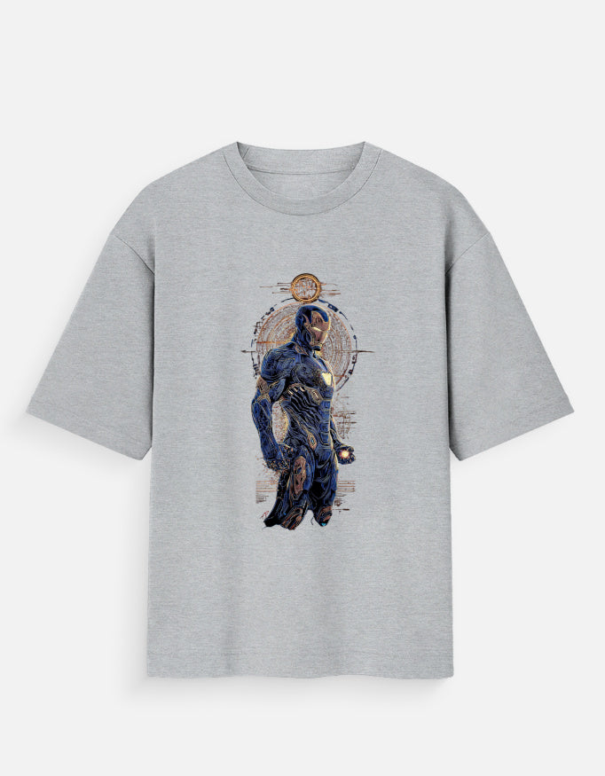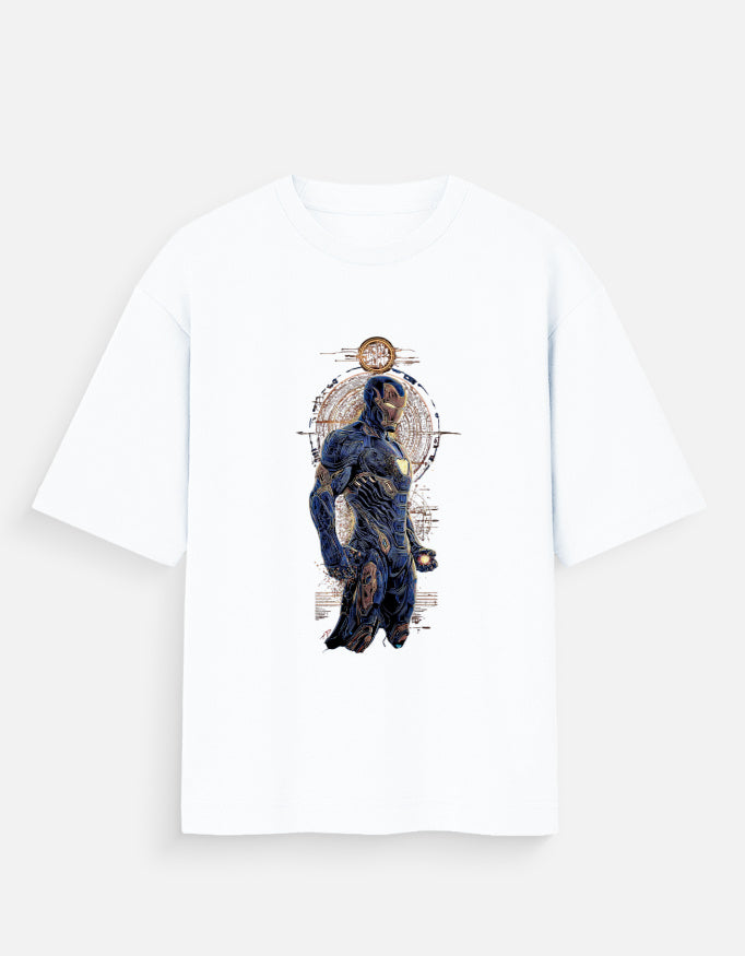 Suit up in futuristic style with this high-detail hero armor graphic tee, featuring a metallic blue suit silhouette over a golden circuit halo. Printed on a crisp white, mid‑weight fabric, the design blends sci‑fi linework with luminous accents for a premium, gallery‑poster look. The relaxed, drop‑shoulder fit keeps it comfortable for everyday wear while delivering standout streetwear energy