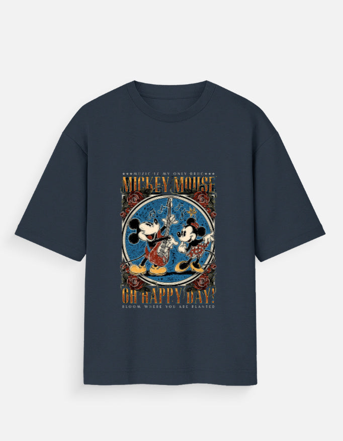 Turn up the good vibes with this retro concert‑poster style tee featuring a joyful mouse duo, musical notes, and floral frame details. “Oh Happy Day!” headlines the design for a feel‑good finish that pops against the deep black base. Cut in a relaxed, drop‑shoulder silhouette, it blends nostalgic charm with everyday streetwear comfort.