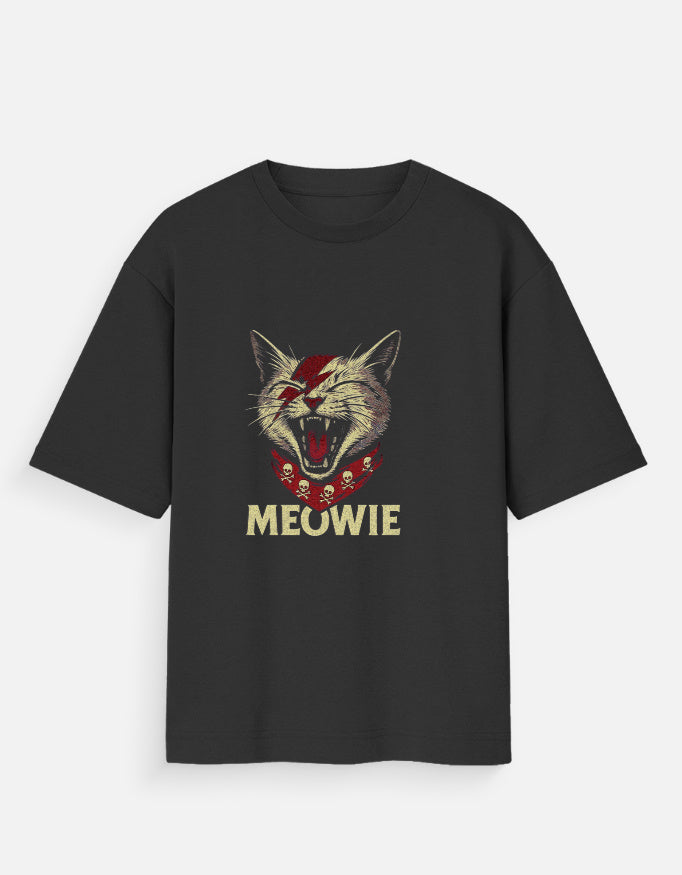 Crank up the cattitude. This bold graphic tee features a roaring feline with a lightning-bolt face mark and skull‑bandana details over the headline “MEOWIE.” Printed on deep black, mid‑weight fabric, it delivers a relaxed, drop‑shoulder silhouette that’s equal parts rock‑n‑roll and streetwear. Pair it with denim, cargos, or a leather jacket for instant edge.