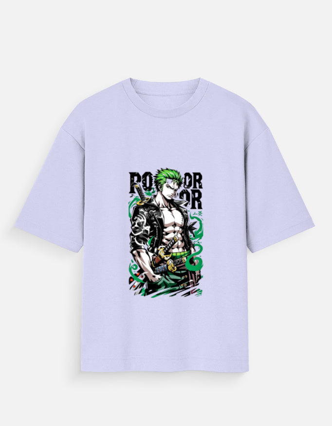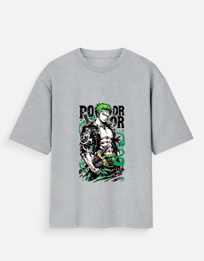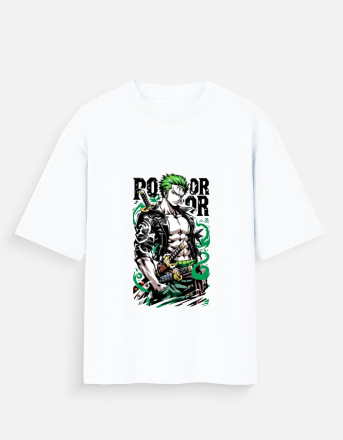 Sharpen the fit with this high‑impact anime‑inspired tee featuring a green‑haired swordsman in a battle‑ready stance, dual katanas at the hip and bold graffiti typography. Vivid emerald accents and inky linework pop on a crisp white base, delivering a premium poster look with everyday comfort. The relaxed, drop‑shoulder silhouette makes it easy to style with cargos, denim, or layered under a jacket.