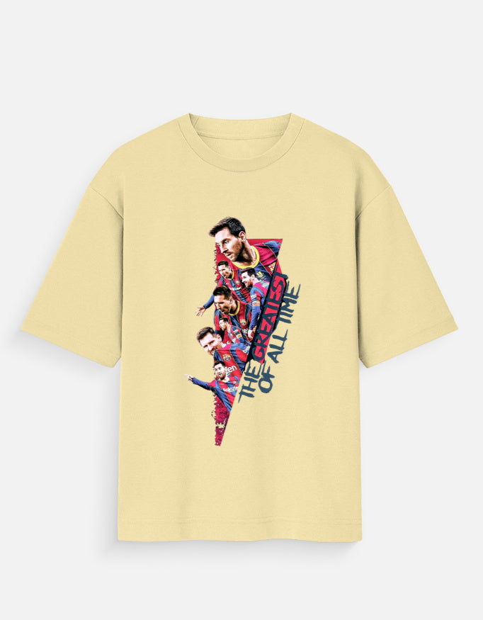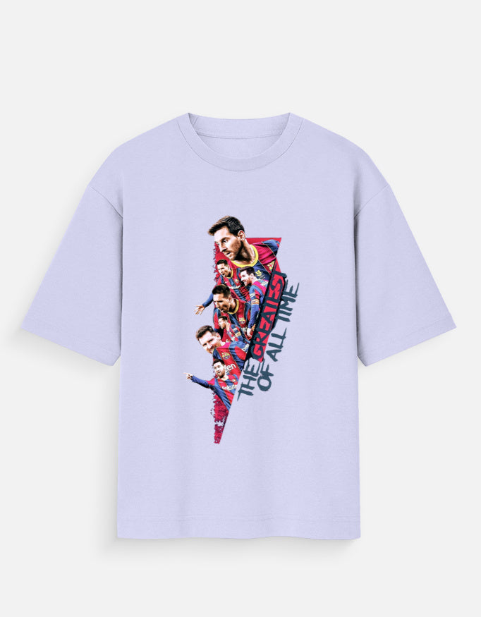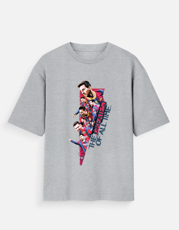 Celebrate an icon with this dynamic collage tee showcasing a star forward in multiple action poses alongside the bold slanted tagline “The Greatest of All Time.” Vivid crimson and electric blue accents explode against the deep black base for a stadium‑ready look. Cut in a relaxed, drop‑shoulder silhouette, it blends street style with fan energy for match days, meetups, or everyday wear.