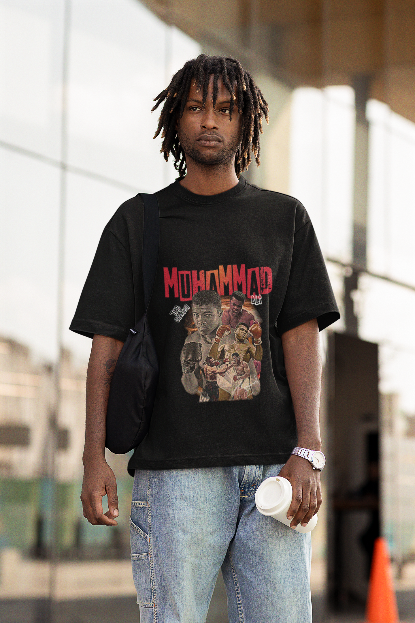 Float like a butterfly, sting like a statement. This retro collage tee spotlights Muhammad Ali through dynamic fight moments, ringside portraits, and bold distressed “MOHAMMAD ALI” lettering for a vintage‑poster vibe. Printed on deep black, the rich sepia and red tones deliver knockout style, while the relaxed, drop‑shoulder silhouette keeps it comfortable for everyday wear, gyms, or street fits.
