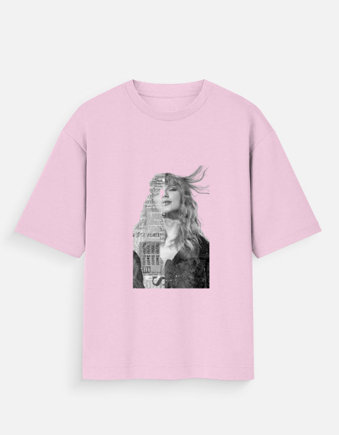 Step into the spotlight with the Retro Muse Oversized Tee, featuring a bold monochrome collage-style graphic design that blends vintage newspaper textures with modern portrait art. Crafted from 100% premium cotton, this oversized T-shirt offers a relaxed streetwear fit with drop shoulders for ultimate comfort and style.
