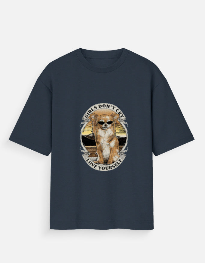 Cute with attitude. This statement tee features a retro‑style oval graphic of a cool Pomeranian in shades, framed by scroll banners that read “Girls Don’t Cry” and “Love Yourself.” Printed in warm vintage tones on a deep black base, it blends soft aesthetics with bold self‑love energy. The relaxed drop‑shoulder fit keeps it effortlessly comfy with cargos, denim, or shorts.