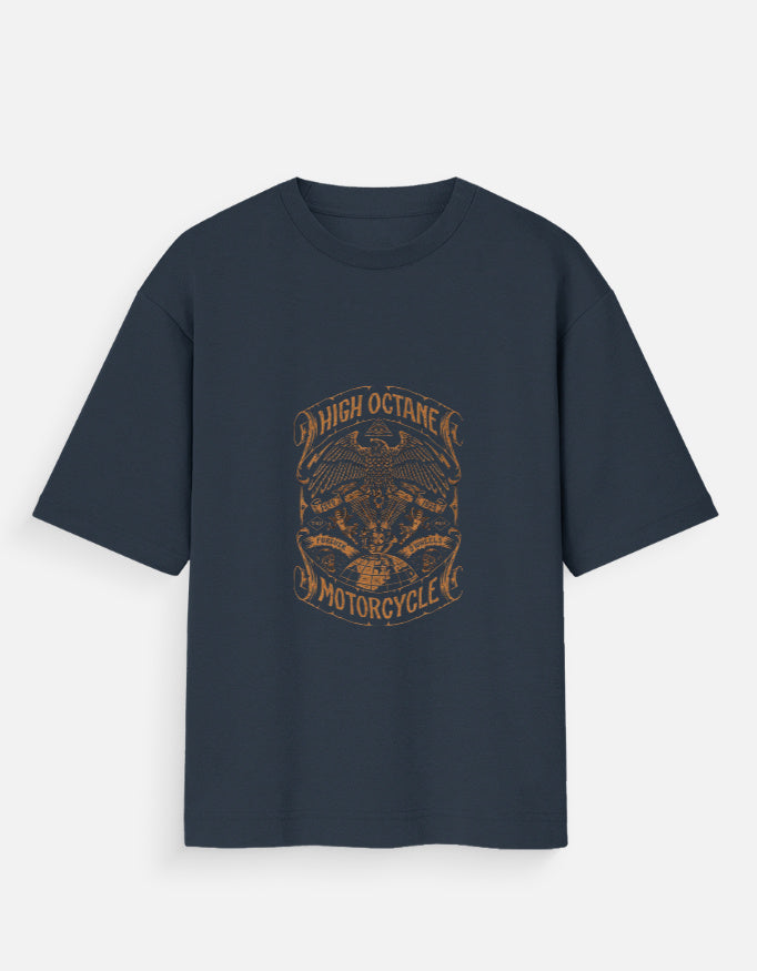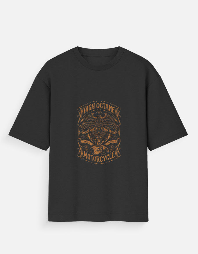 Built for the open road. This statement tee features a vintage biker‑patch graphic with a soaring eagle, pistons, banners, and globe details, all rendered in a burnished bronze tone that pops against the deep black base. The artwork reads like a classic garage crest, while the relaxed drop‑shoulder silhouette keeps it effortlessly comfy with denim, cargos, or leather layers.