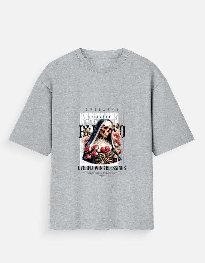 Level up your streetwear game with the Overflowing Blessings Oversized Tee — a bold fusion of edgy art and spiritual symbolism. Featuring a skeletal nun clutching a broken heart surrounded by blooming roses, this piece speaks volumes without saying a word. Layered with powerful text like “Guidance,” “Blessed,” and “Overflowing Blessings,” it's made for those who walk their own path with soul and attitude.