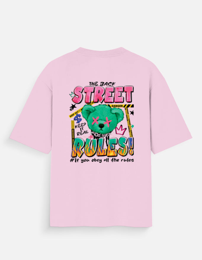 This oversized pink tee features a chaotic-cute graphic of a glitchy green bear with street-style warnings, neon graffiti, and the rebellious slogan: “If you obey all the rules, you miss all the fun.”