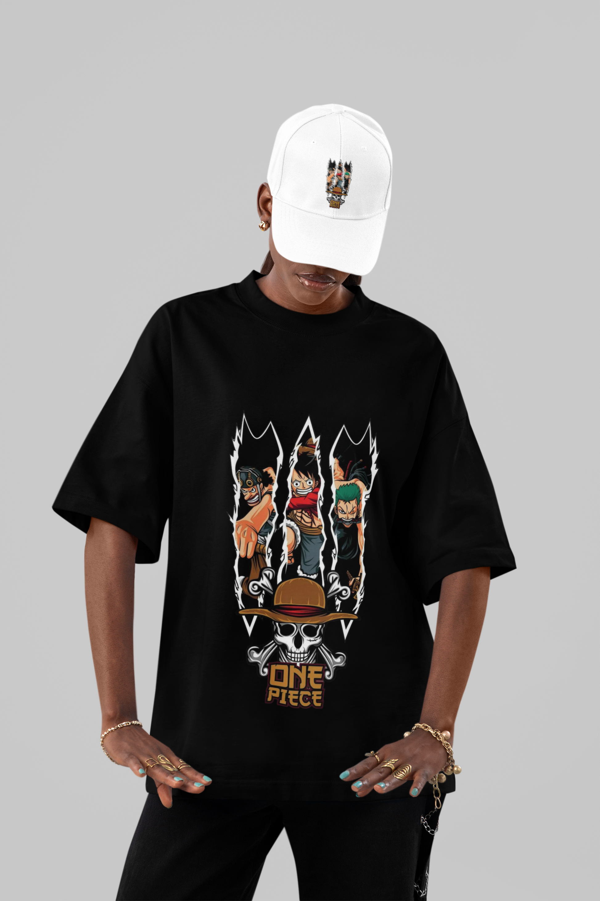 Unleash your inner pirate with the One Piece Trio Slash Tee – a bold oversized black t-shirt featuring Luffy, Zoro, and Ace slashing through the fabric in an electrifying anime design. Crafted for comfort and built for fans, this tee merges high-quality streetwear style with iconic anime energy. Finished with the Straw Hat Jolly Roger and “One Piece” logo, it's a must-have for true followers of the Grand Line.