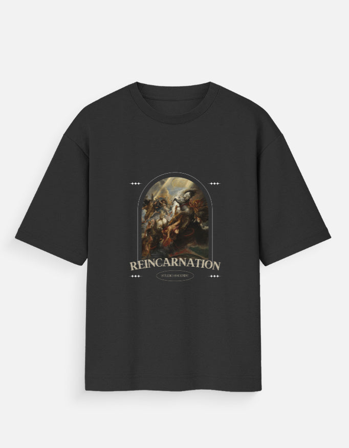 Channel timeless energy with the Reincarnation Oversized Tee from Studio Shoowe. Featuring a dramatic Renaissance-style painting framed within an arched window design, this tee merges art history with modern streetwear aesthetics. The muted tones and elegant typography evoke themes of rebirth, cycles, and eternal presence — making this piece both philosophical and fashion-forward.